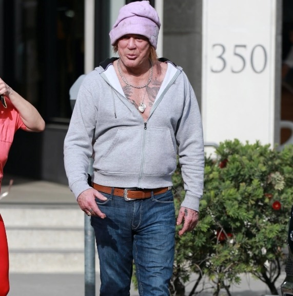 En una rara aparición pública, el actor de 72 años Mickey Rourke fue fotografiado fuera de su hogar en Beverly Hills. La estrella de películas como 9 1/2 Weeks lucía visiblemente desaliñado, con una sudadera gris sin cerrar y sin camiseta, pantalones deportivos verdes y zapatillas. Su cabello gris despeinado completaba el look casual mientras pasaba aproximadamente una hora conversando con un técnico de control de plagas, según las fotos obtenidas por Page Six.