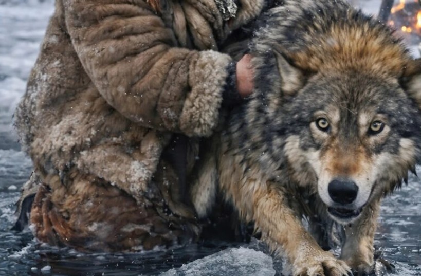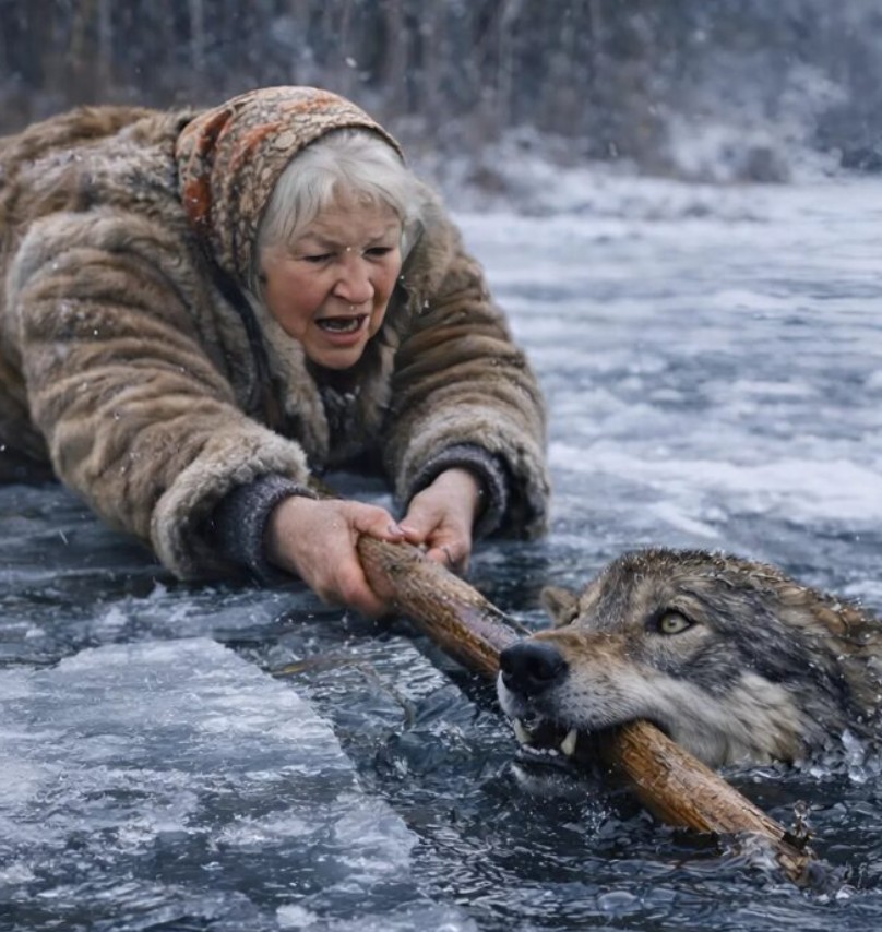 Det var en isende vinterdag, og overflaten på innsjøen i fjellet var dekket av et tynt lag med is. En gammel kvinne samlet ved da hun så en enorm ulv som desperat slo rundt seg der isen hadde brutt. Dyrets klør gled på isen, og for hver bevegelse sank den dypere ned i det kalde vannet. Kvinnen brydde seg ikke om at det var et villdyr; hun la seg på snøen og rakte den lange grenen sin mot ulven. Til tross for den knasende lyden fra isen ga hun ikke opp og dro med all sin styrke det utmattede dyret opp av vannet.