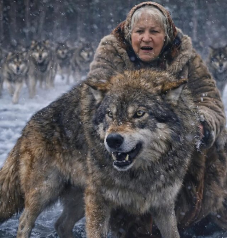 Ulven lå på isen, gjennomvåt og skjelvende, og pustet tungt; det så ut som om et av bakbena var brukket. Kvinnen trakk seg tilbake i frykt, men plutselig oppdaget hun bevegelse dypt inne i skogen. Fra trærne dukket ti par glødende øyne opp. Det var ulvens flokk. Ulvene hadde merket en fremmed og beveget seg raskt mot dem. Den gamle kvinnen innså at hun hadde ingen fluktvei og sto lammet av skrekk.