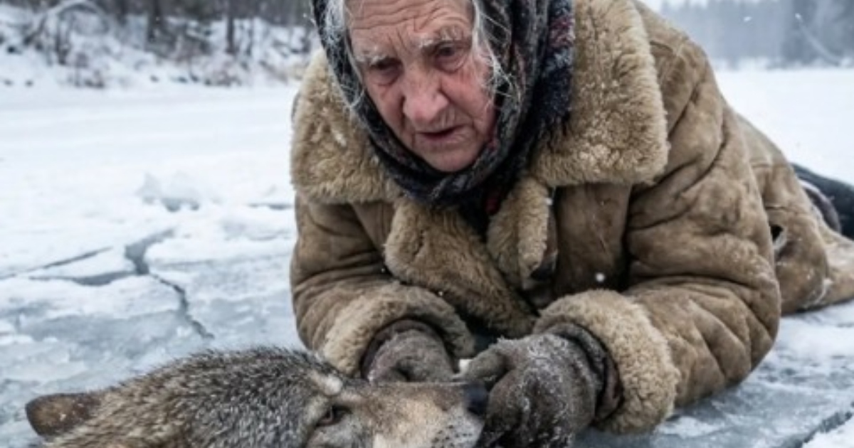 Det var en isende vinterdag, og overflaten på innsjøen i fjellet var dekket av et tynt lag med is. En gammel kvinne samlet ved da hun så en enorm ulv som desperat slo rundt seg der isen hadde brutt. Dyrets klør gled på isen, og for hver bevegelse sank den dypere ned i det kalde vannet. Kvinnen brydde seg ikke om at det var et villdyr; hun la seg på snøen og rakte den lange grenen sin mot ulven. Til tross for den knasende lyden fra isen ga hun ikke opp og dro med all sin styrke det utmattede dyret opp av vannet.