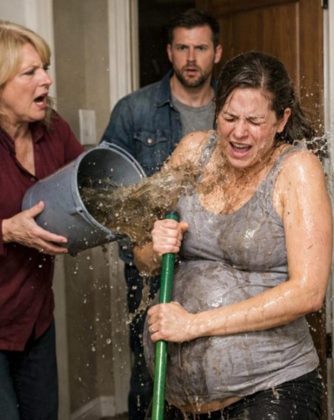 Dejando sus cosas lentamente en el suelo, pronunció el nombre de su madre con un tono que llenó toda la casa de un silencio absoluto. Con delicadeza pero firmeza, retiró el cubo de las manos de su madre y lo dejó a un lado. Luego se quitó la chaqueta y la colocó sobre los hombros empapados de su esposa, abrazándola con fuerza contra su pecho. Mirando a los ojos de su madre, dijo: “Ya basta”, con una voz más potente que nunca.