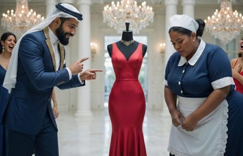 En el suntuoso salón de mármol del jeque Halid, se preparaba una elegante velada. Leyla, una modesta sirvienta de unos cuarenta años, cumplía silenciosamente con sus tareas entre la multitud, mientras un deslumbrante vestido rojo, colocado sobre un maniquí en el centro del salón, captaba todas las miradas. La prenda, diseñada a medida para la amante del jeque, era tan ajustada y lujosa que equivalía a una verdadera fortuna. Fascinada, Leyla no pudo evitar tocarlo mientras pasaba; Halid lo notó y, frente a todos los invitados, comenzó a humillarla: “¿Cómo te atreves a tocar una tela más valiosa que toda tu vida?”, rugió.