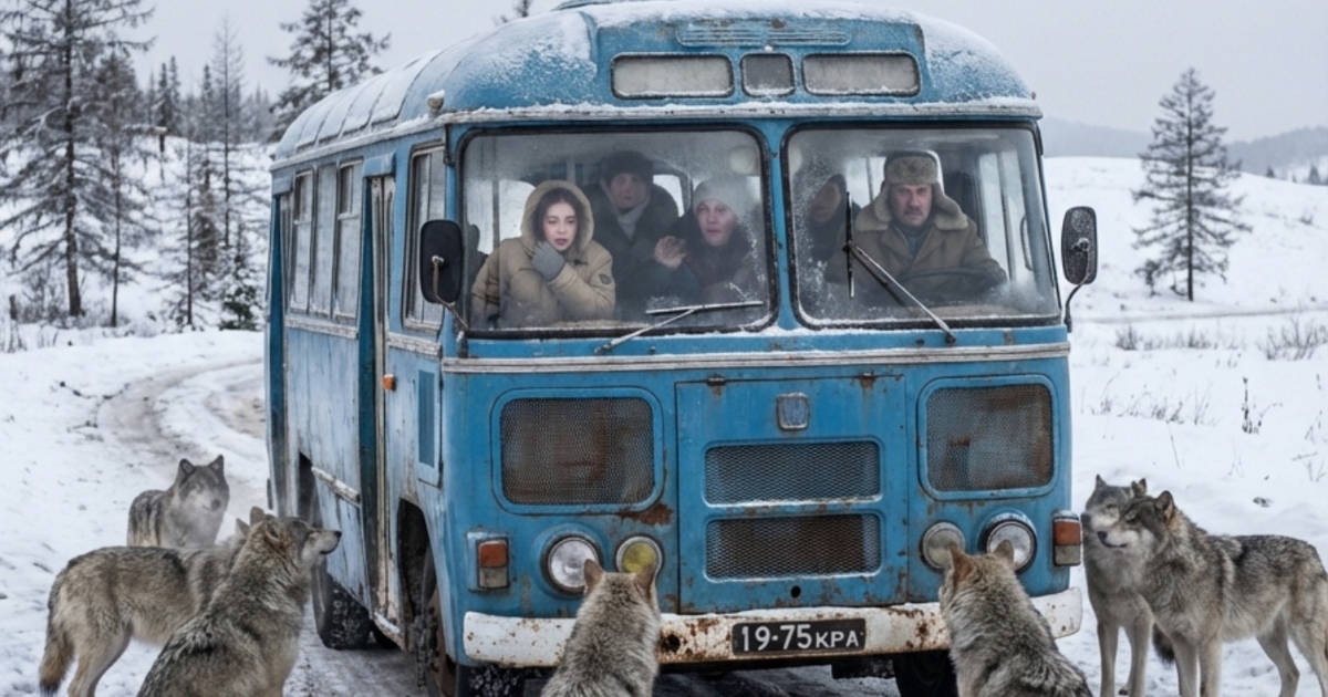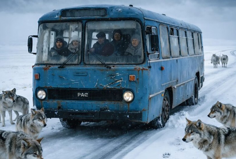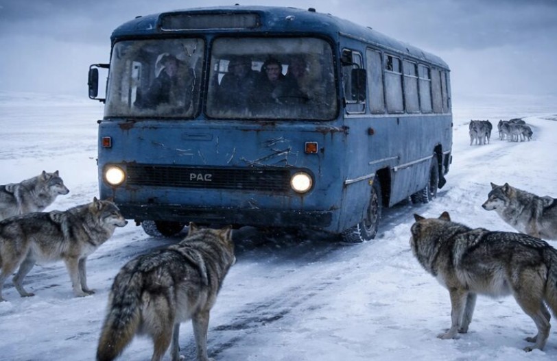 Mens vinterstormen raste med full kraft, kjempet bussen, kjørt av den erfarne femtiårige sjåføren, seg langs den snødekte veien. Passasjerene fulgte nervøst med på det hvite mørket bak frostmønstrene på rutene, da bussen plutselig sakket farten. Sjåføren hadde øynene knipet sammen, og hendene knyttet seg hardere rundt rattet. Fra snøens slør kom først én, så fem, og snart dusinvis av grå silhuetter ut på veien. Det var ikke hunder, men en enorm ulveflokk. Da bussen stoppet, fylte iskald frykt alle som var ombord; de ville dyrene omringet bussen stille og bare ventet.