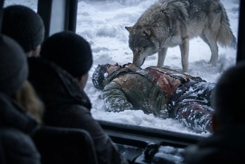 Mens passasjerene skrek i panikk over at dørene var låst, fanget ulvenes merkelige oppførsel alles oppmerksomhet. De hverken knurret eller slo mot rutene; de sto bare stille, som om de ville peke på noe. Sjåføren tørket dugg fra frontruten og oppdaget at ulvenes blikk ikke var rettet mot bussen, men mot en snøhaug ved veikanten. Da vinden et øyeblikk stilnet, ble silhuetten av en menneskekropp under snøen tydelig.