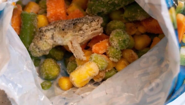 I det øyeblikket jeg skjønte at det ikke var en grønnsak, frøs jeg helt fast på kjøkkenet. Med en skje dyttet jeg grønnsakene litt til side, og da så jeg små lemmer som lignet fingre. Like etter kom konturen av et lite hode til syne mellom isbitene. Det var en liten frosk, helt stivfrossen. Den hadde blitt frosset sammen med grønnsakene og pakket ned, og alt tydet på at den ved et uhell hadde blitt fanget opp under innhøstingen ute på åkeren.